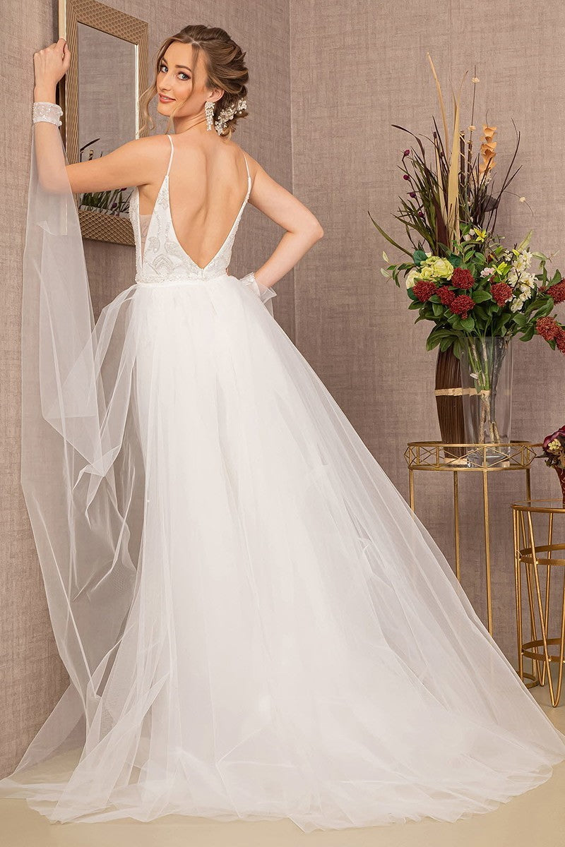 Promote attention-grabbing style in this stunning Elizabeth K GL3157. This is a perfect bridal gown for outdoor affairs with its tulle overskirt and figure-contouring feature thanks to the trumpet silhouette. Has a deep neckline and a bodice embellished with appliques. Its arm sash that is directly connected to the overskirt adds more drama on your special day. Show off your gentler side with this lovely gown by Elizabeth K GL3157. Model is wearing Ivory color.