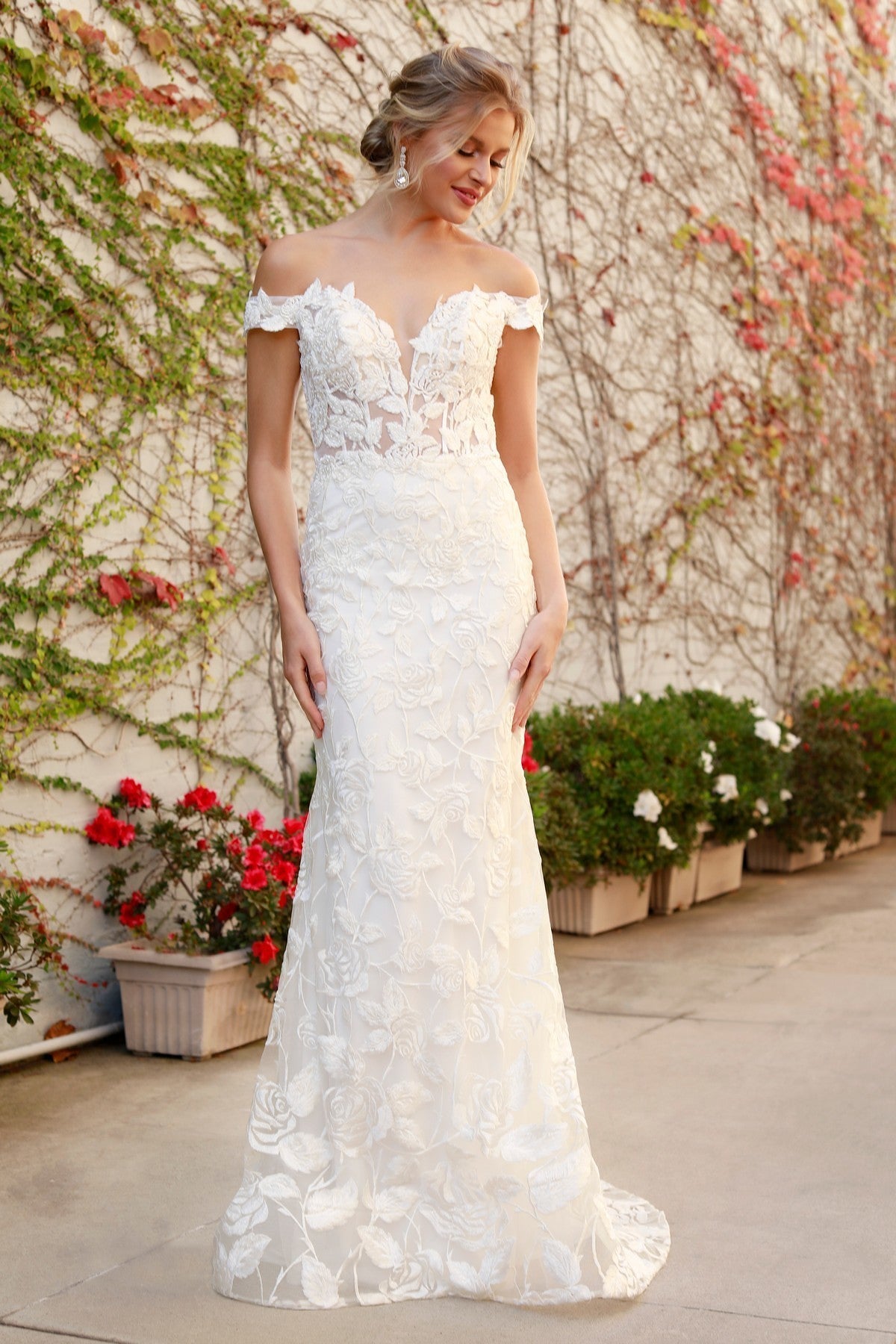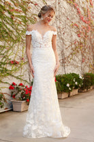 Dare to show off your stellar style on your wedding day in this Nox Anabel Bridal C439W creation. Festooned with intricate floral embroidered details on a sheer tulle bodice, this piece parades an off shoulder neckline with a v-neck plunge. Detailed with a sheer corset bodice that rhymes with its illusion v-open back. The floral adorned mermaid skirt flows into a sweep of train. Leave them astounded in this Nox Anabel Bridal masterpiece. This stunning collection of Nox Anabel dresses will reflect your personality and give you an elegant red-carpet look. Model is wearing the White color.