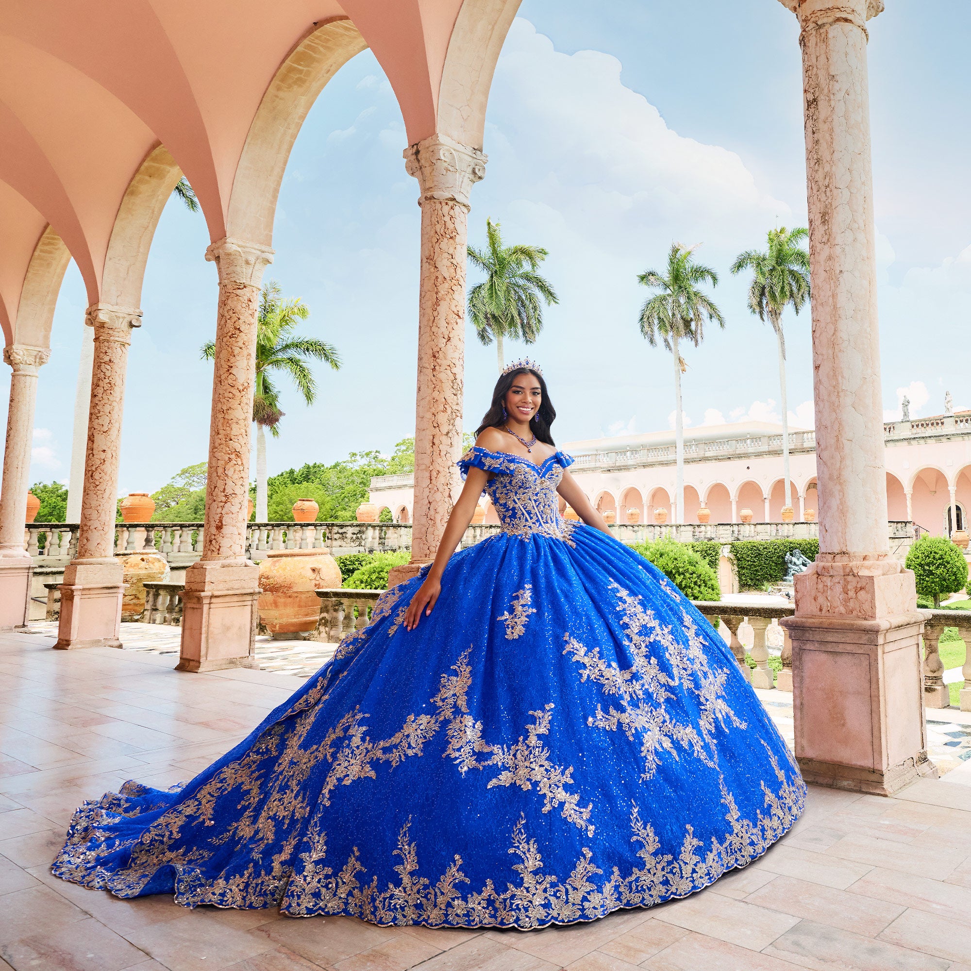 Celebrate your Quinceañera in this gorgeously regal ball gown. Crafted from luxurious allover lace, and adorned with delicate lace applique and shimmering beading, this stunning gown radiates sophistication. Unique ruffled off-the-shoulder sleeves and sparkling sequins add a touch of opulence to your look, while the stunning cathedral train adds a dramatic flourish. A matching caplet provides versatility to create two majestic Quinceañera looks in one!