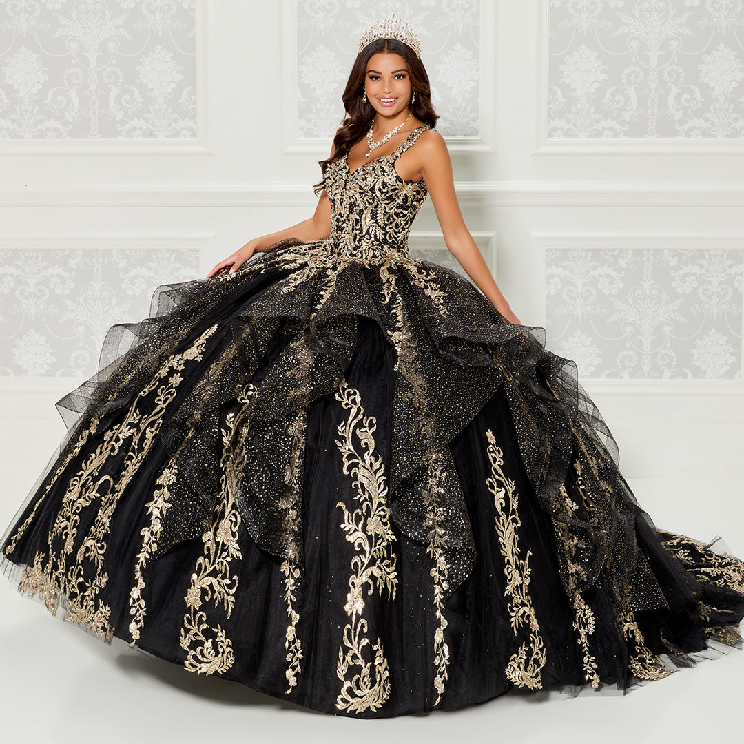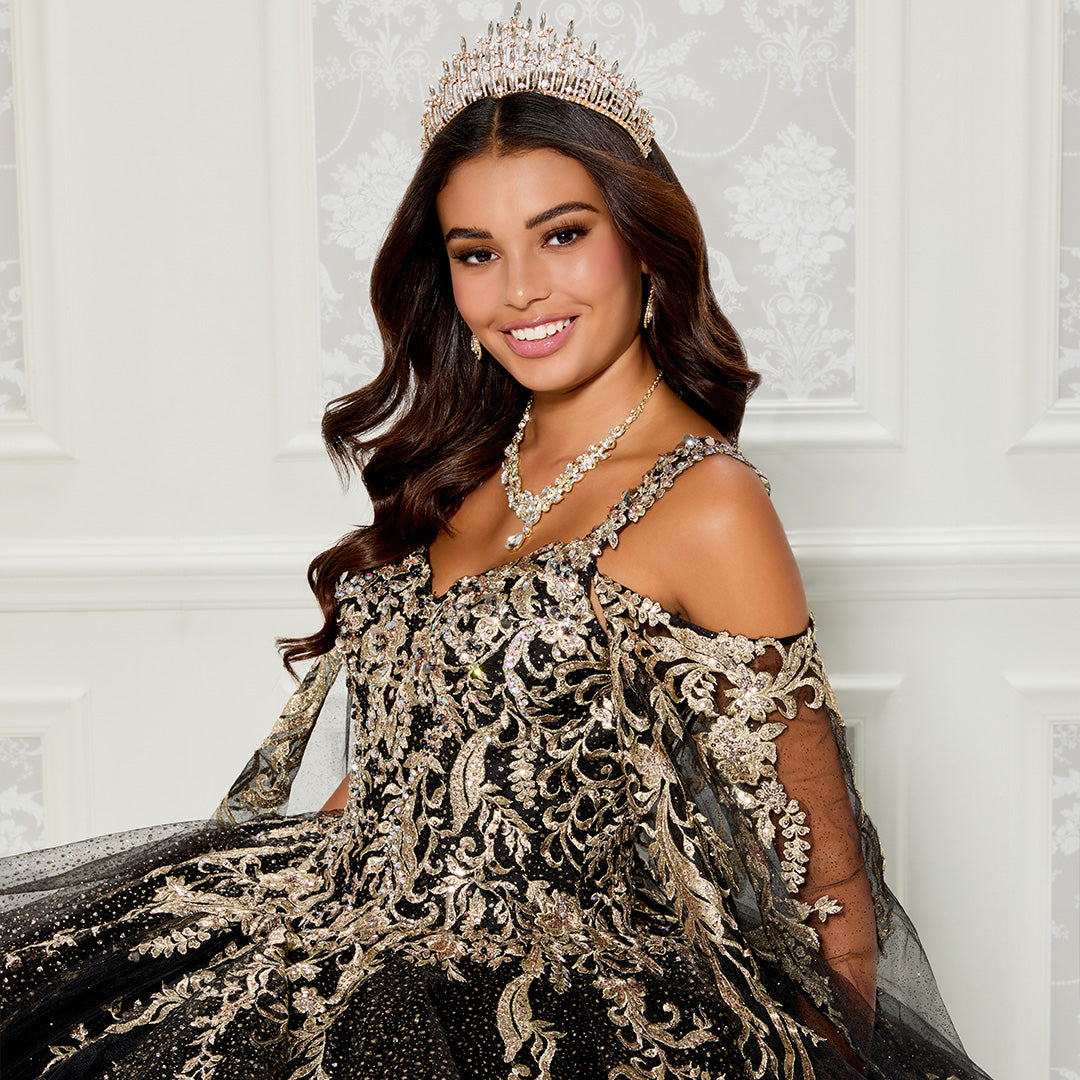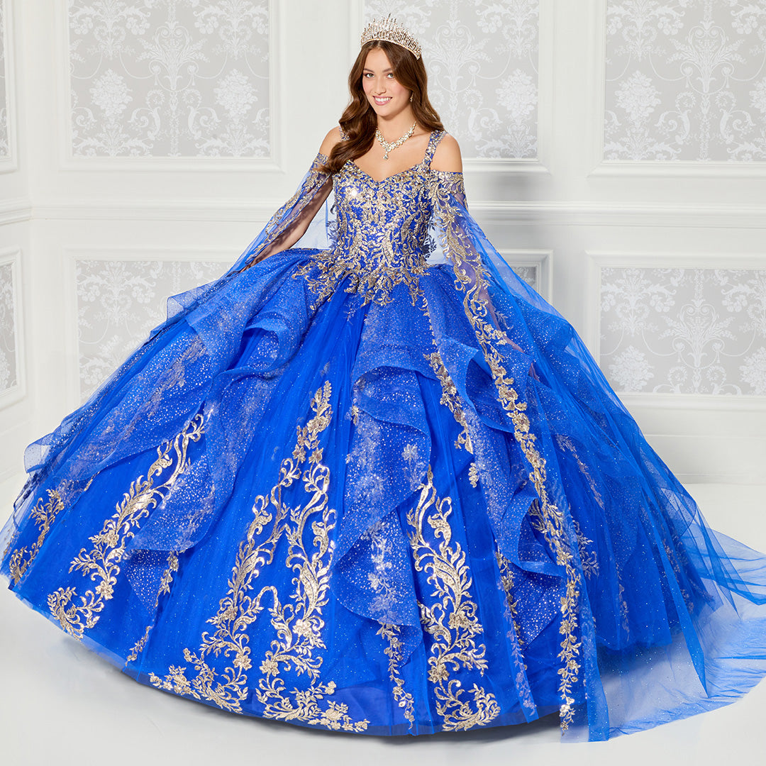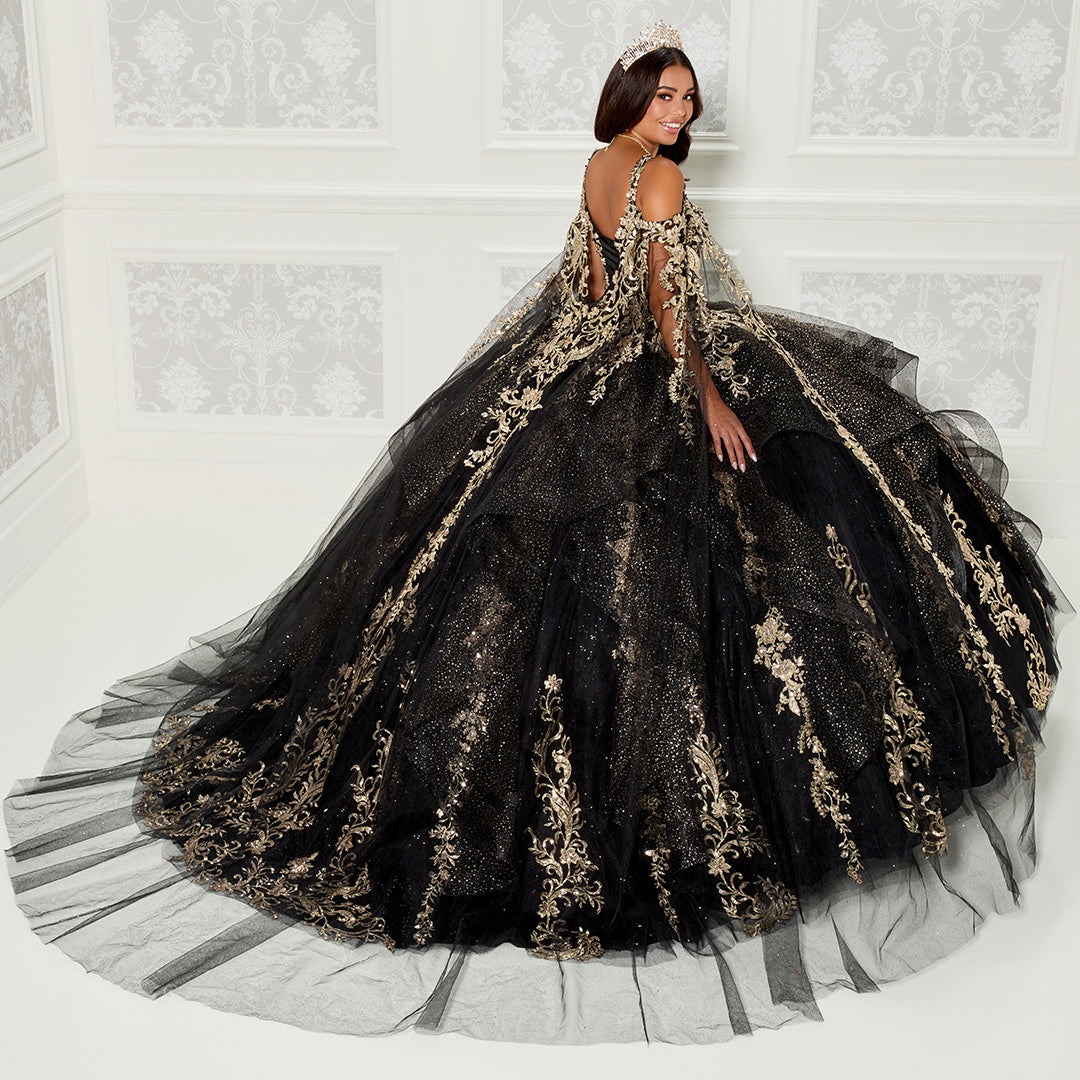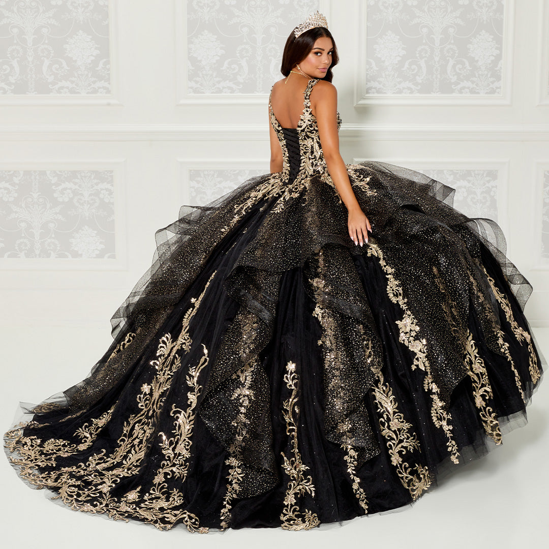 Charm everyone with the iridescent appeal of this glamorous Princesa by Ariana Vara PR30117 creation. Showing off a spectacle of intricate bead festooned gold metallic appliques, this beauty features a deep v-neckline with tank straps. Cinching the elaborate bodice with a corset styled open back, the skirt flaunts glittering ruffled layers that flows into a ballgown silhouette with an applique ornate train. This ensemble has a matching detachable long cape. Be a queen of your own right in this fascinating Princesa by Ariana Vara masterpiece. Models are wearing the Black/Gold and Royal/Gold colors.