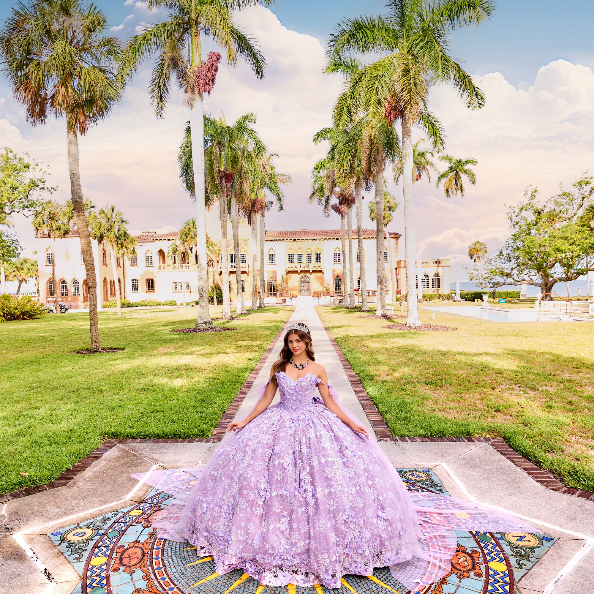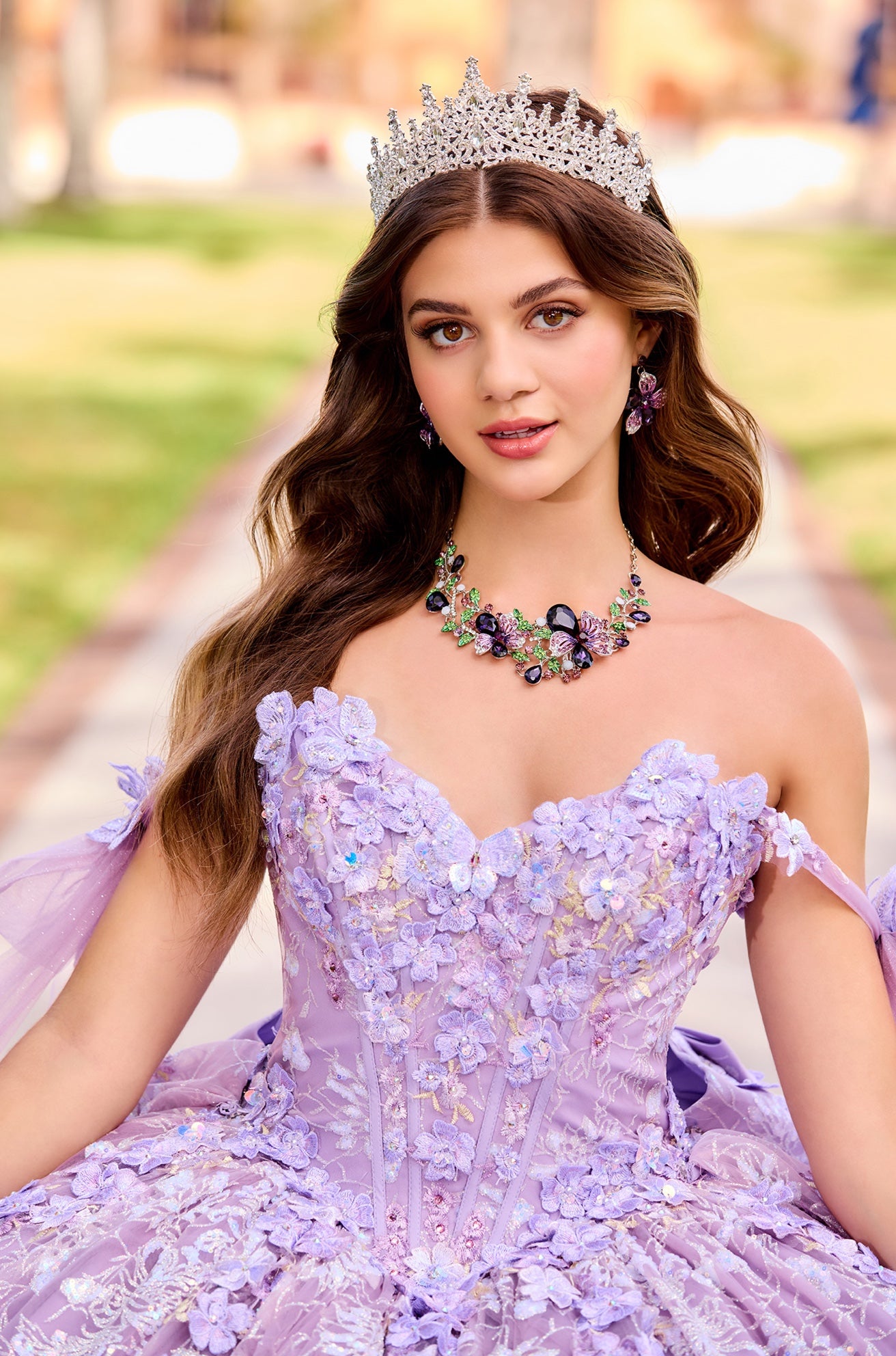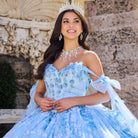 Princesa by Ariana Vara PR30135 ice blue quinceanera gown features a corset-boned sweetheart bodice with removable bow straps and floor-sweeping streamers. Beaded 3D floral appliques luxuriously embellish this cracked ice sweet 16 dress, finished with a floral basque waist, a low laced-up back, and a detachable panel train with a large bow.
