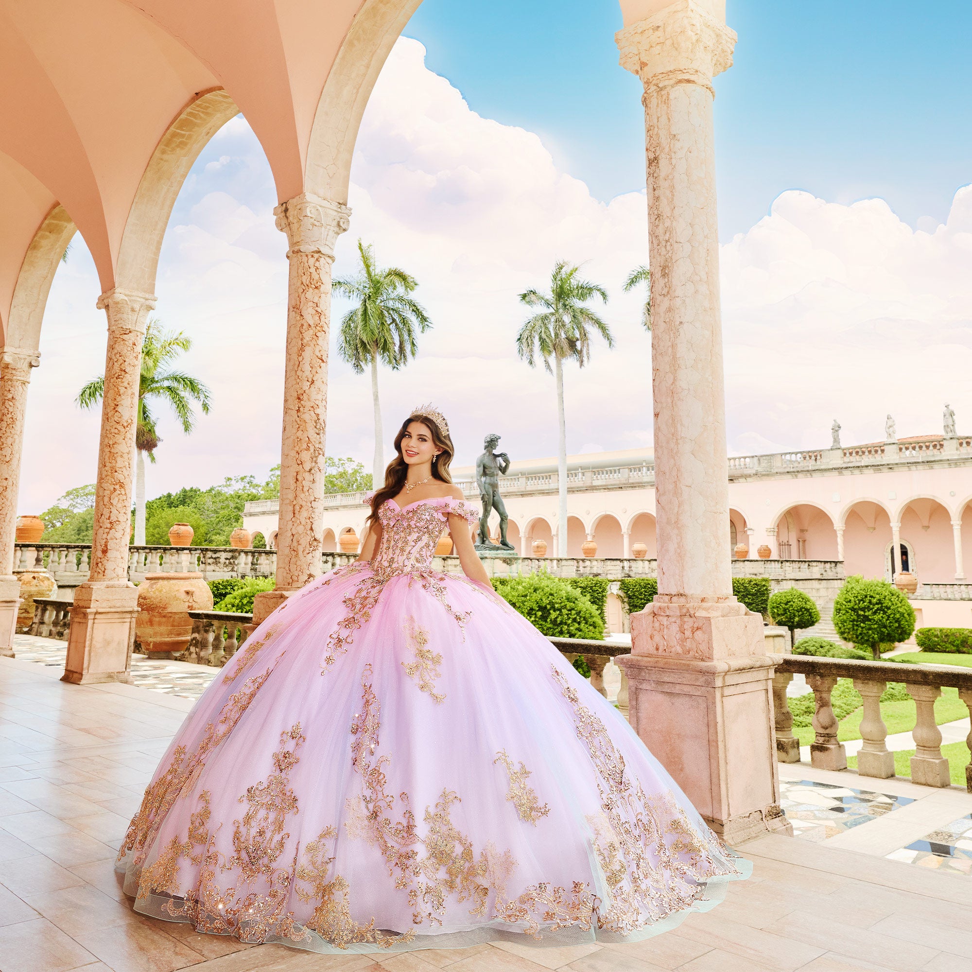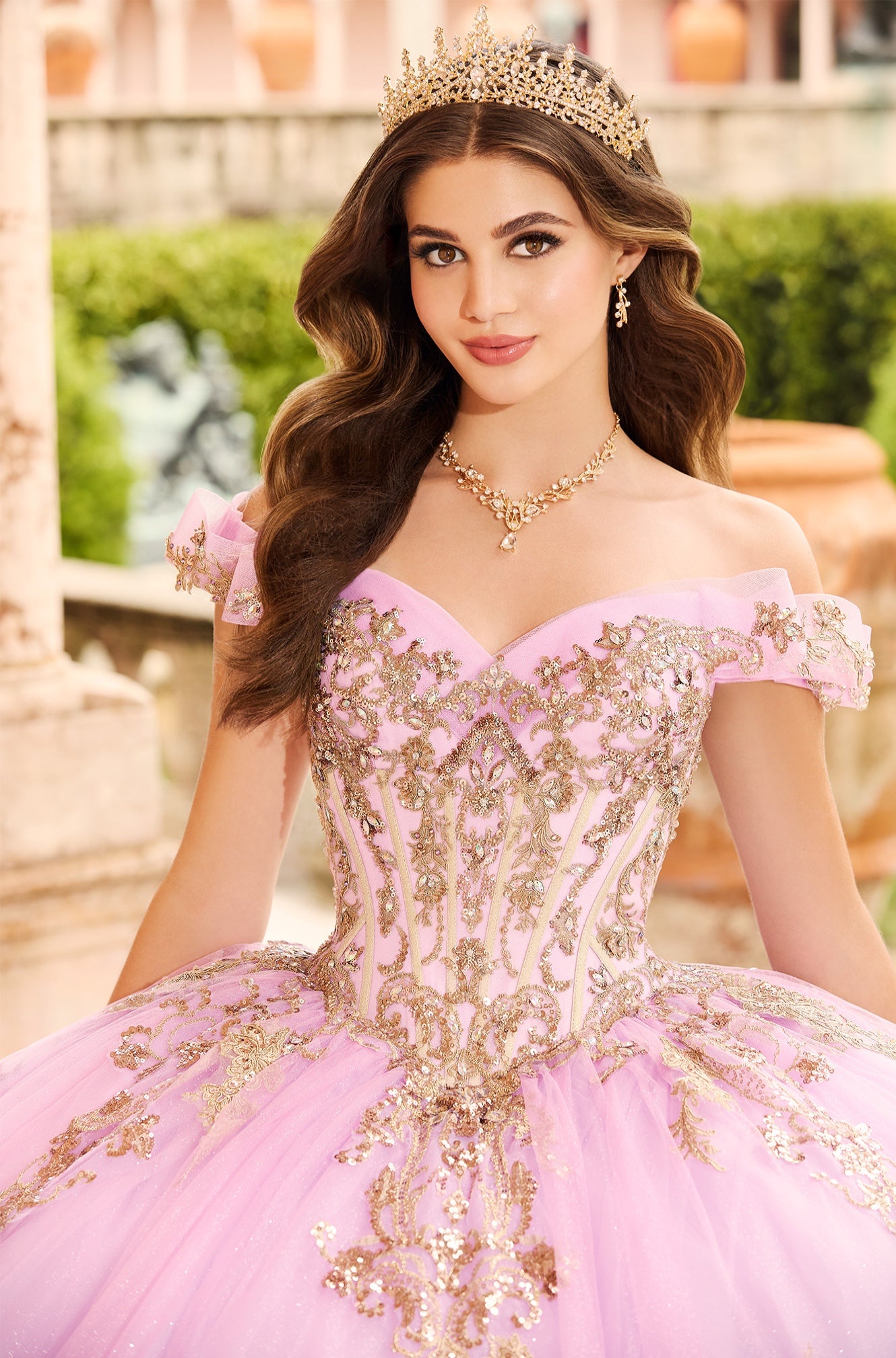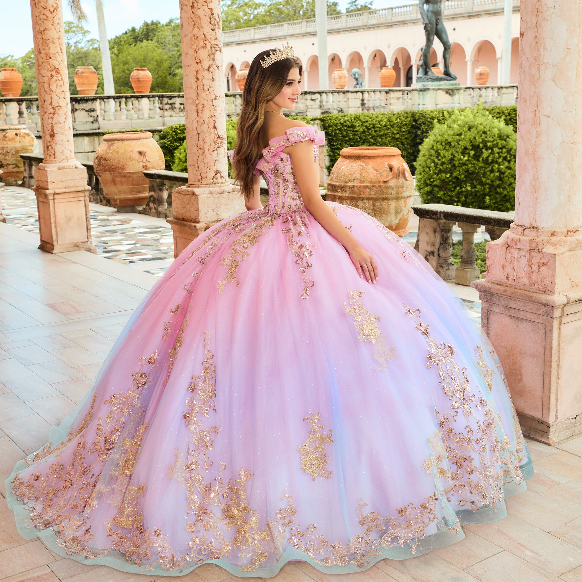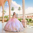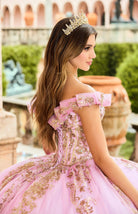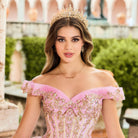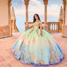Princesa by Ariana Vara PR30152 ombre glitter tulle quince dress enhanced with sequined lace appliques features a corset bodice with a sweetheart neckline. Stylish off-the-shoulder traps, a lace-up back, a basque waist, and a gathered skirt accent this quinceanera ballgown, finished with a horsehair hem and a sweep train. A matching capelet is included.