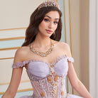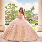 Princesa by Ariana Vara PR30154 sweet 16 ballgown crafted in luxe brocade with beaded 3D floral appliques features an off-the-shoulder sweetheart neckline. This charming quince dress has a corset bodice with pleated bust, detachable straps, and a mid-rise lace-up back, complete with a basque waist, a gathered skirt, and a sweep train. This set includes a matching capelet.