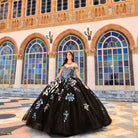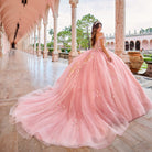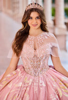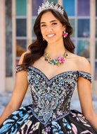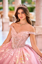 Make a statement on your special day with this unforgettable ball gown. Crafted from sparkling glitter tulle and sequins, this gown boasts a bold design that shimmers and sparkles with every step you take. The sweetheart neckline is ultra-flattering, while the off-the-shoulder design adds a touch of romance to your Quinceañera style. A pretty matching caplet completes this one-of-a-kind look.