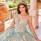 Get ready to shine and create unforgettable memories in this spectacular Quinceañera ball gown. With its sparkling sequins, delicate lace applique, and charming three-dimensional flowers, this stunning gown is simply breathtaking. A detachable bow and regal cathedral train add a touch of drama that is guaranteed to leave a lasting impression no one will forget!