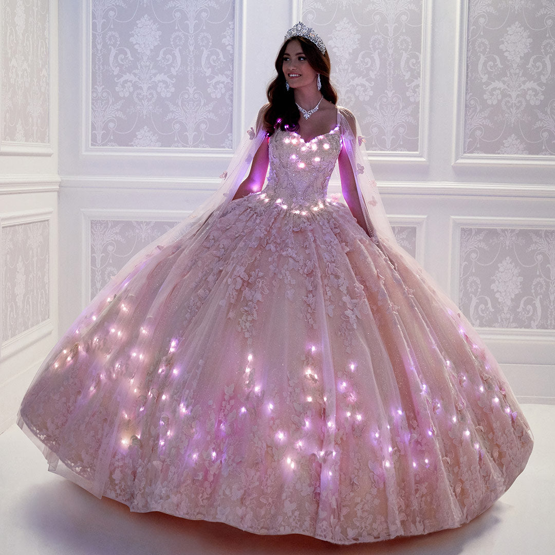 This beautiful ball gown features a v-neckline, full length A-line skirt, lace up corset back, and a sweep train. Detachable Matching Butterfly Cape Included, Matching color lights Included.