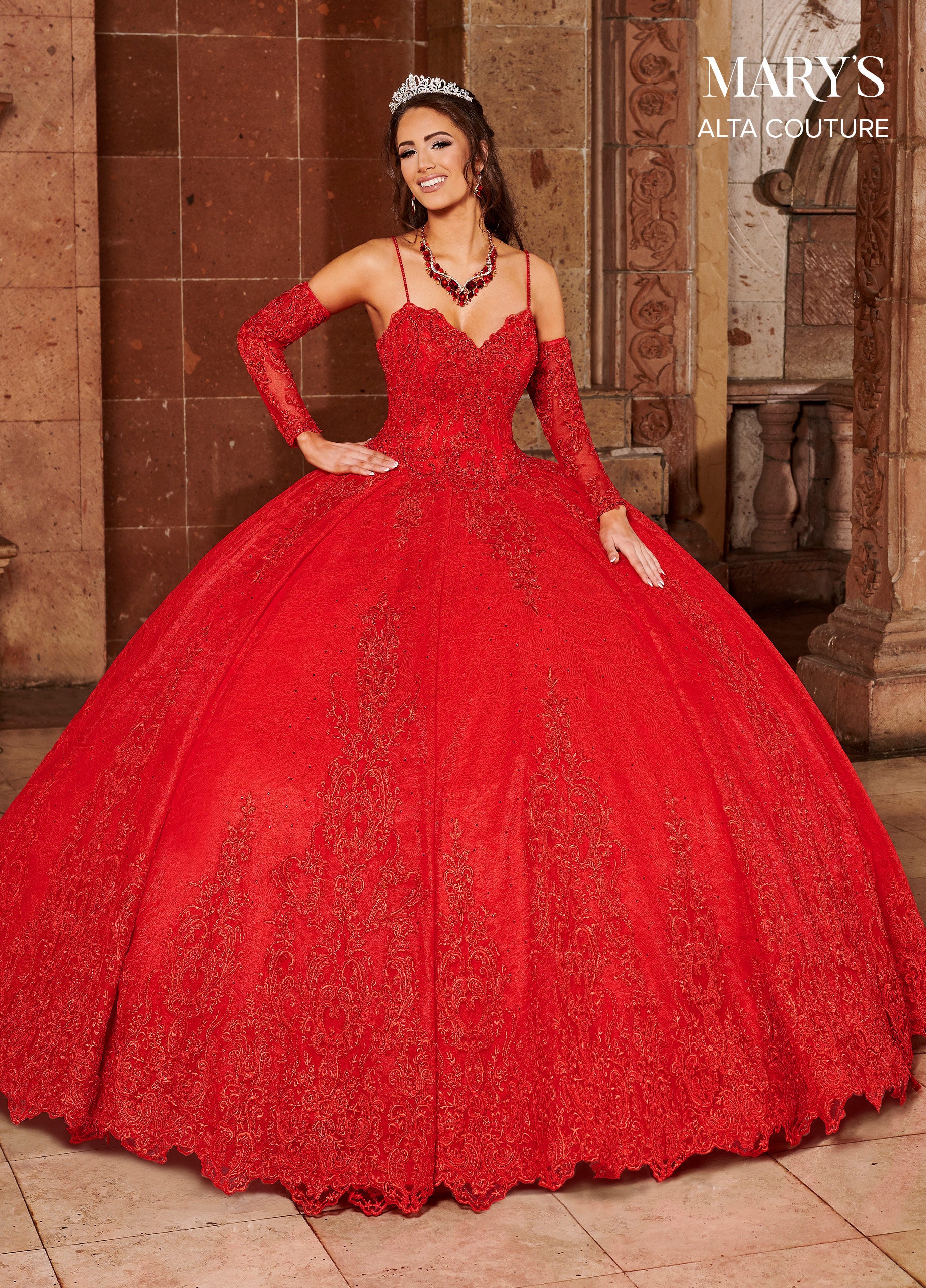 Look breathtaking in this lace embellished long sleeveless dress with A-line skirt by Mary's Bridal Alta Couture MQ3072. Stunning taffeta ball gown with a strapless sweetheart neckline and thin detachable sleeves. The entire gown has been embellished with modern floral applique and tonal crystals. The gown finishes with a lace up back closure and a detachable train with bow. The matching bolero jacket is included.