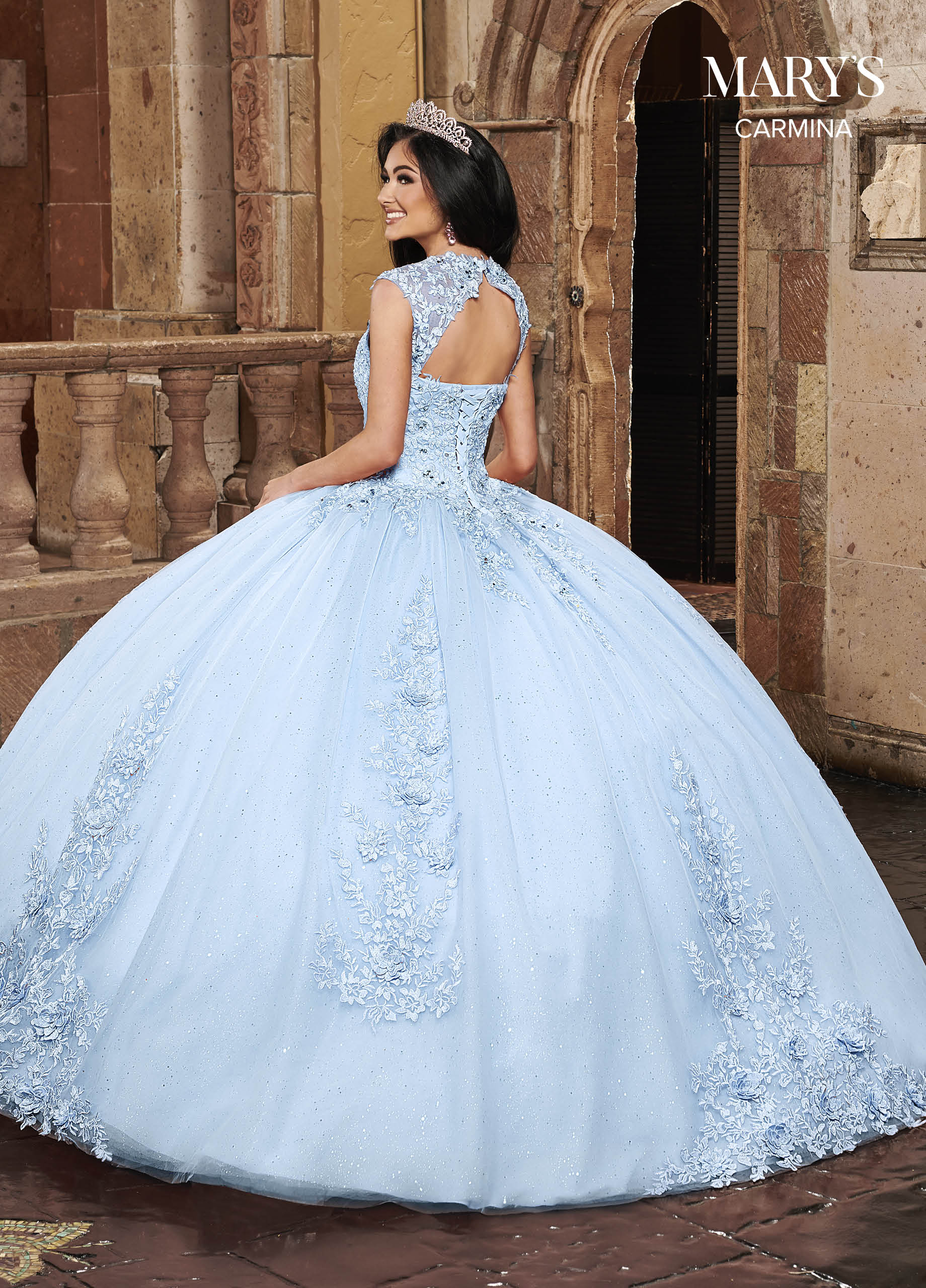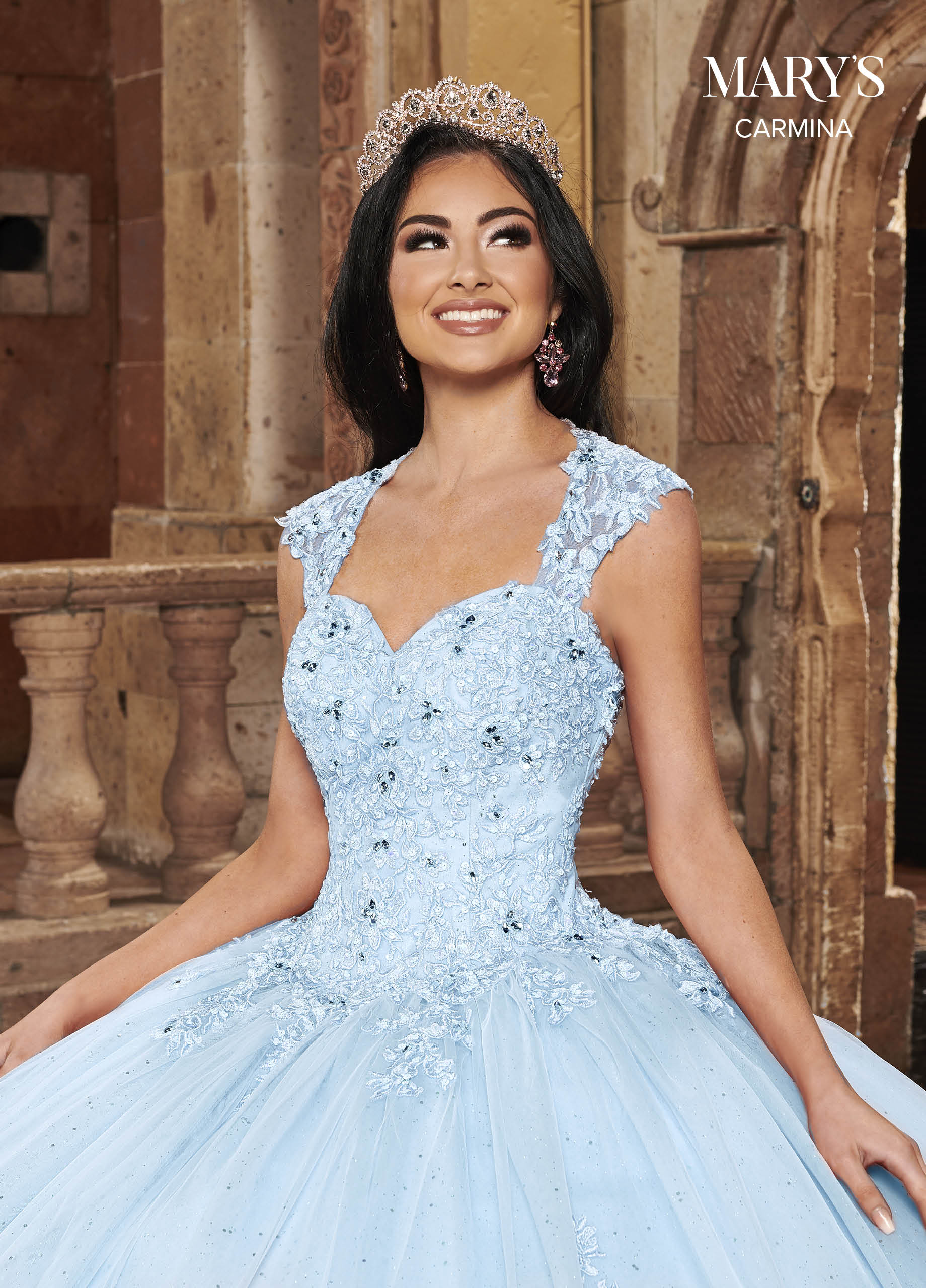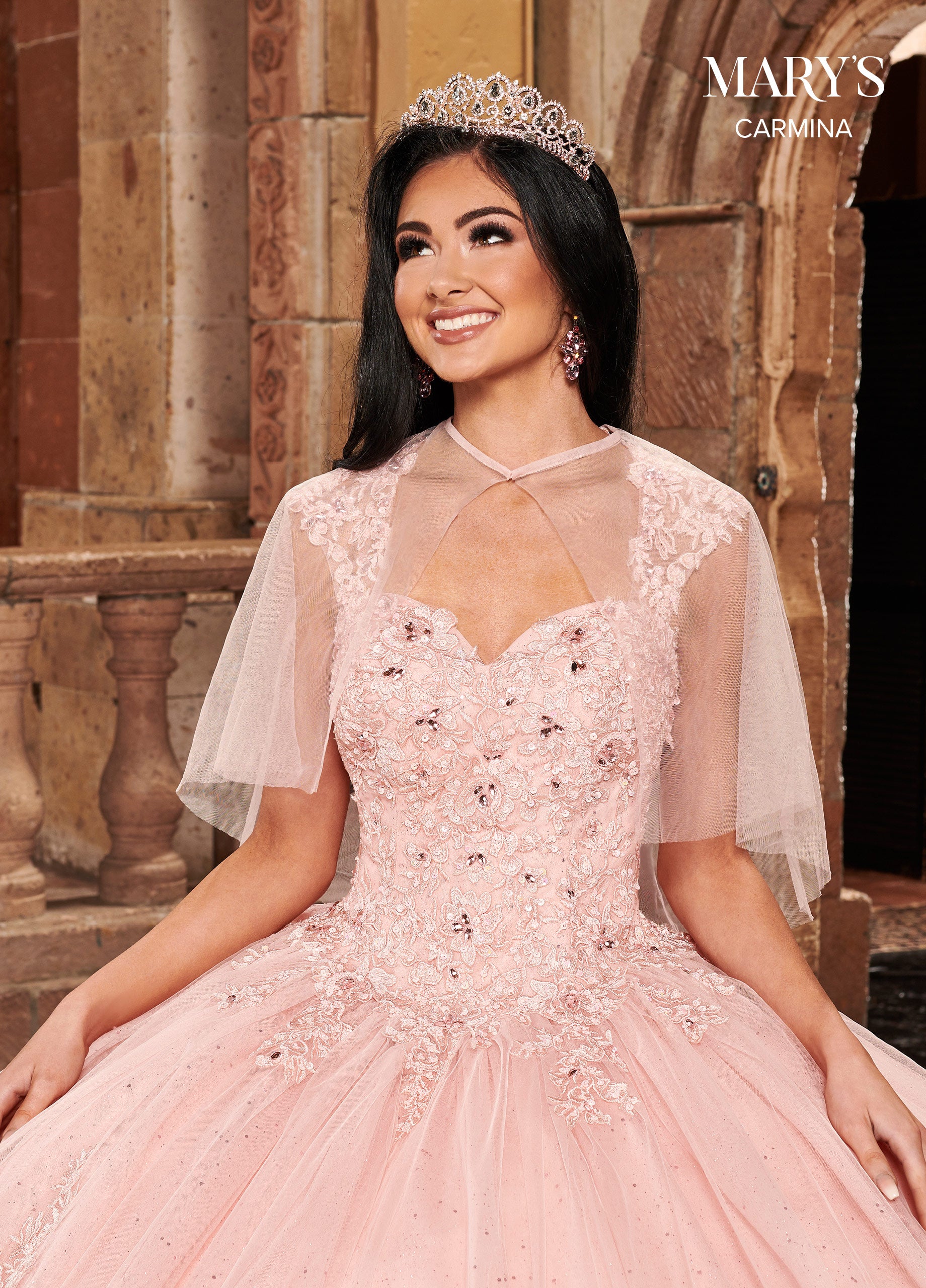 Look like a fairy-tale Princess in this long cap sleeve dress with A-line skirt by Mary's Bridal Quinceanera MQ1081. Sparkling glitter tulle ball gown with a V-shaped neckline and thick straps made of applique. The bodice, cap sleeves and sheer back keyhole yoke have been crystallized and sparkle magically! The gown finishes with a lace up back closure and a sweep train. The matching cape is included.