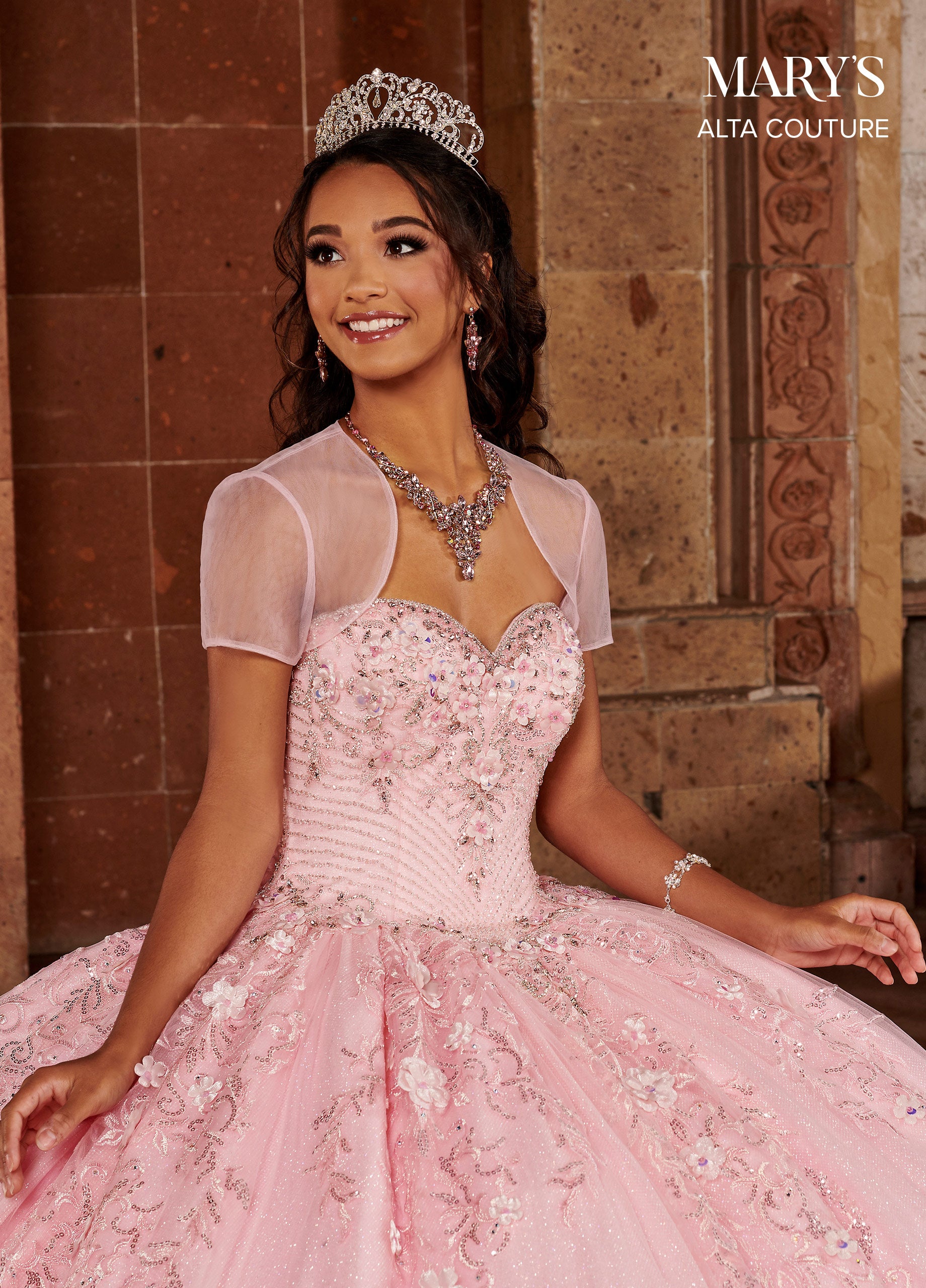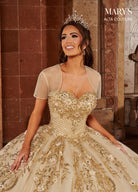 You'll love twirling around in this floral glitter long sweetheart dress with A-line skirt by Mary's Bridal Alta Couture MQ3071. Strapless glittered tulle ball gown with beaded fringe and dazzling crystal beading around the neckline and straps. The full skirt features a floral glittered hem with matching glitter detailing and a sweep train. The matching bolero jacket is included.